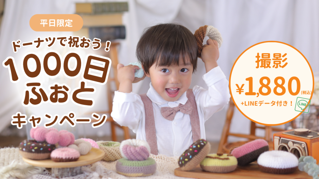 アニーズスタジオで 1000日をお祝いする可愛いフォトキャンペーンが新登場! 🍩 1000日ドーナツフォト1,880円 🍩 ( 撮影料金 + 1カットLINEデータ を含みます) ※平日2組限定の撮影キャン … 続きを読む 1000日ドーナツフォトキャンペーン