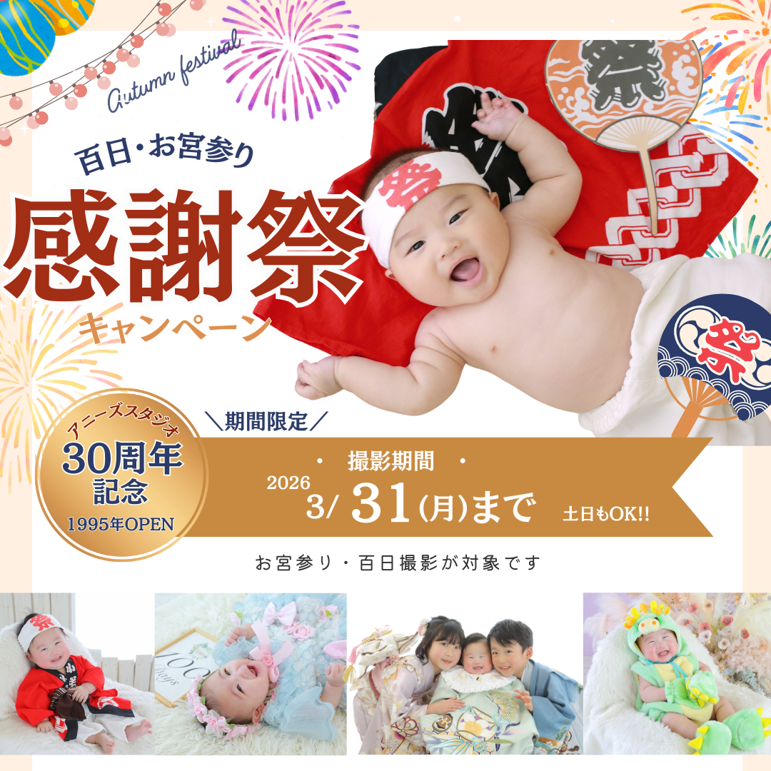全館共通 上越館 長岡館 宮参り・百日祝い もうすぐ30周年★赤ちゃん撮影秋祭りキャンペーン こんにちは!アニーズスタジオです。 赤ちゃんのお写真撮影をご検討中のパパママ! この度、お宮参り・百日祝いの撮影でご利用いただける お得なキャンペーンをご用意しました! 【対象期間】 2026年1月30日(金)まで 【対象者】 生後5か月までの赤ちゃんの撮影 (お宮参り撮影・百日祝い撮影) こちらのキャンペーンを選ばれた際も 最大8特典が利用可能です♪ LINEからのご予約も受け付け中! たくさんのご参加お待ちしております♪