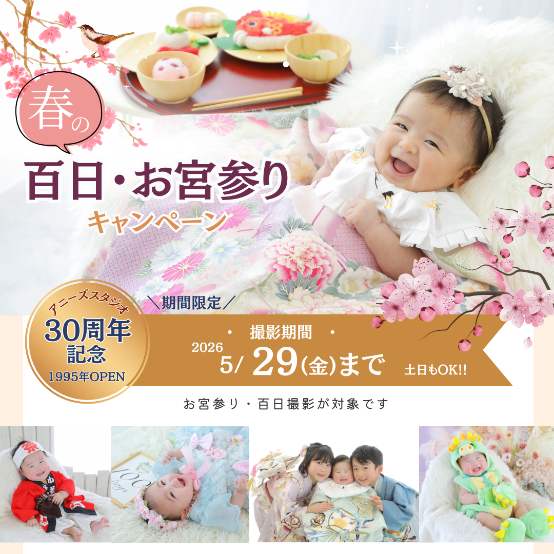 全館共通 上越館 長岡館 宮参り・百日祝い 百日・お宮参りキャンペーン こんにちは!アニーズスタジオです。 赤ちゃんのお写真撮影をご検討中のパパママ! この度、お宮参り・百日祝いの撮影でご利用いただける お得なキャンペーンをご用意しました! 【対象期間】 2026年5月29日(金)まで 【対象者】 生後5か月までの赤ちゃんの撮影 (お宮参り撮影・百日祝い撮影) こちらのキャンペーンを選ばれた際も 最大8特典が利用可能です♪ LINEからのご予約も受け付け中! たくさんのご参加お待ちしております♪