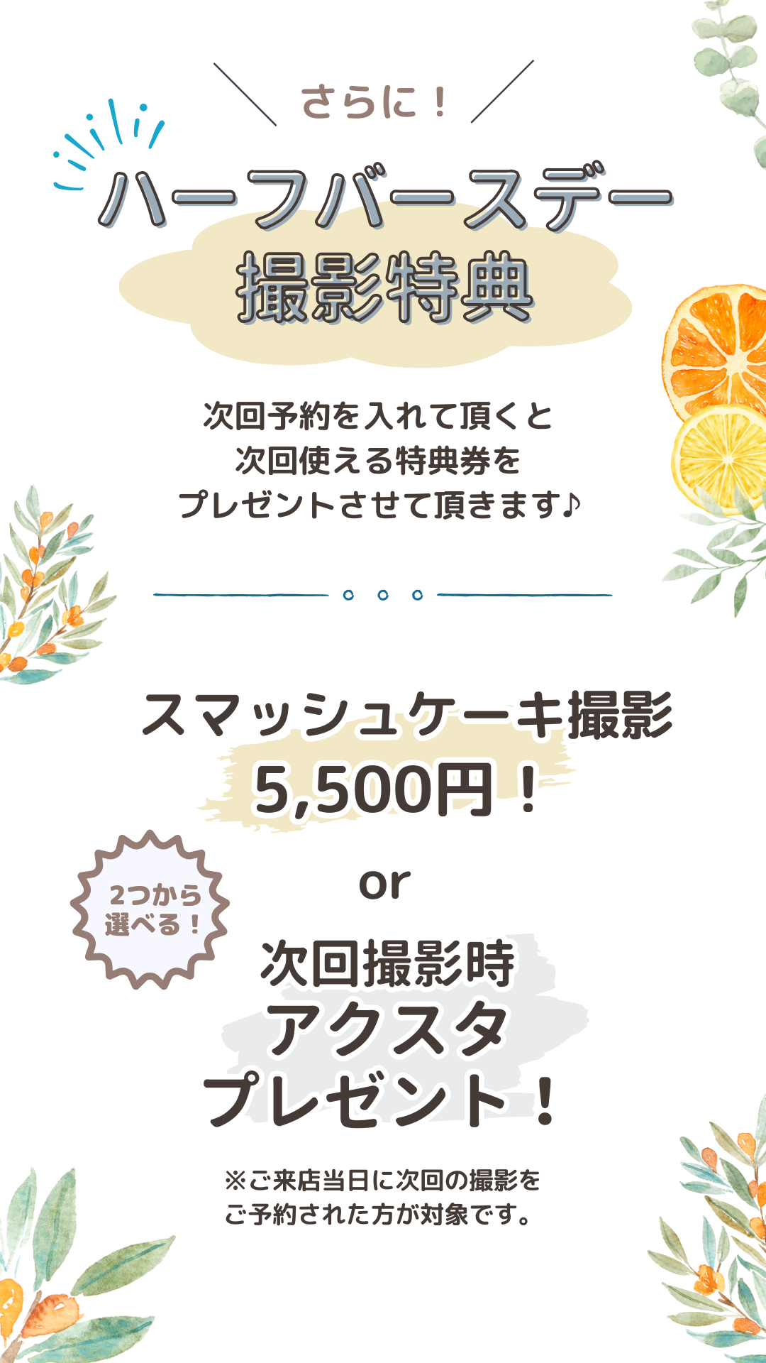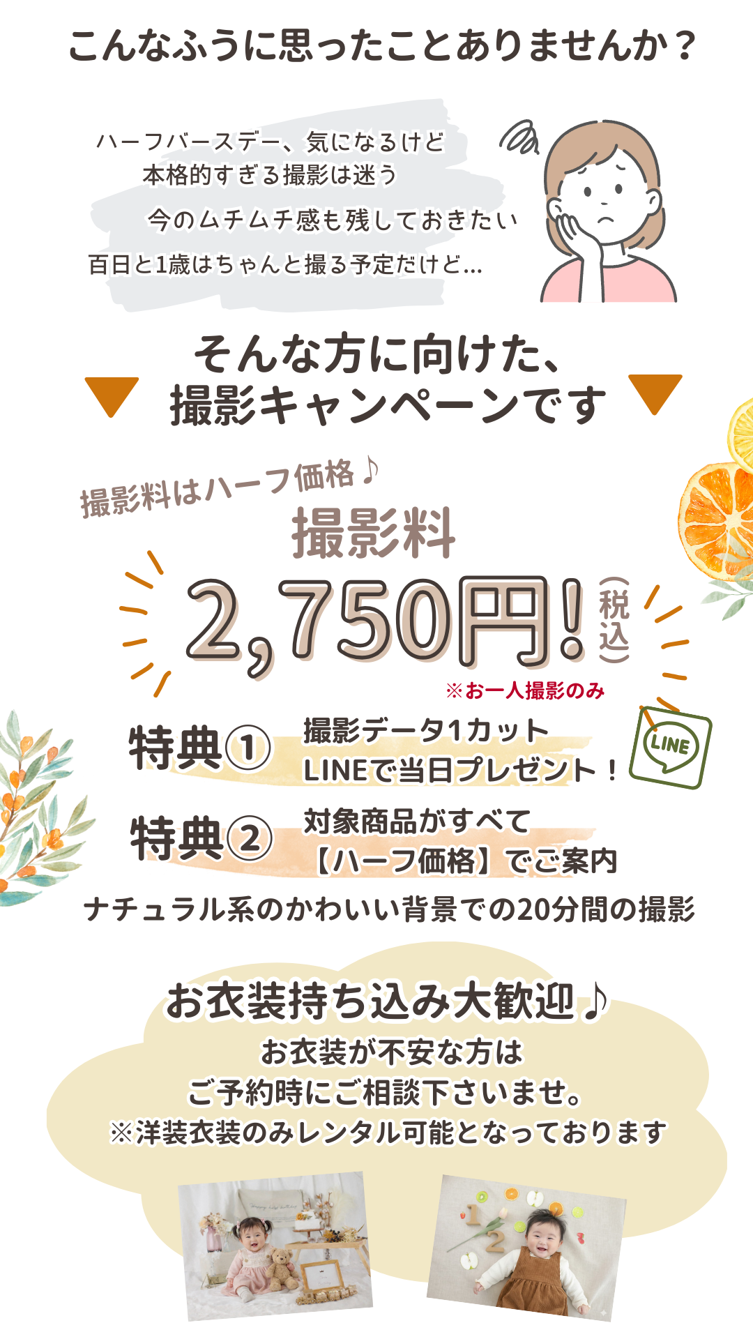 上越館・長岡館 キャンペーン撮影会 ハーフバースデーキャンペーン こんにちは!アニーズスタジオです♪ アニーズスタジオでは【平日限定】ハーフバースデーキャンペーンを開催します! 対象年齢:生後6ヶ月前後のあかちゃん 撮影料:2750円(税込)※お一人のみ キャンペーンの内容 撮影時間:約15分 ナチュラル可愛い専用セットでの撮影 LINEデータ【1ポーズ】プレゼント その他、対象商品もハーフ価格にてご案内 ♪ お問い合わせはこちらから↓↓ ご予約お待ちしております!
